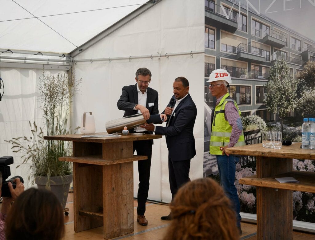 „Und jetzt kommen wir zum offiziellen Akt der heutigen Veranstaltung“, verkündet Alexander Sälzle und befüllt ein futuristisch anmutendes, längliches Objekt: die Zeitkapsel. Ein Zollstock und einige Münzen kommen hinein, zwei aktuelle Tageszeitungen, eine Broschüre des Holzhybrid-Ensembles VINZENT, ein Mini-Bauherr in Form einer Kunststoffpuppe und ein Tütchen Pflanzensamen. Die Kameras klicken, das Publikum applaudiert, die Kapsel wandert vom Projektleiter in die Hände von Richard Krause, dem Polier. Sie werde tagsdrauf ins Fundament einbetoniert, wie man erfährt. Eine traditionelle Handlung für ein zukunftsträchtiges Projekt. Ein Symbol für die Ewigkeit obendrein. Denn man hoffe natürlich, so Projektleiter Sälzle, dass die VINZENT-Kapsel in 10.000 Jahren den Neuanfang einer wegweisenden und nachhaltigen Bauweise symbolisieren wird – daher das Samentütchen.