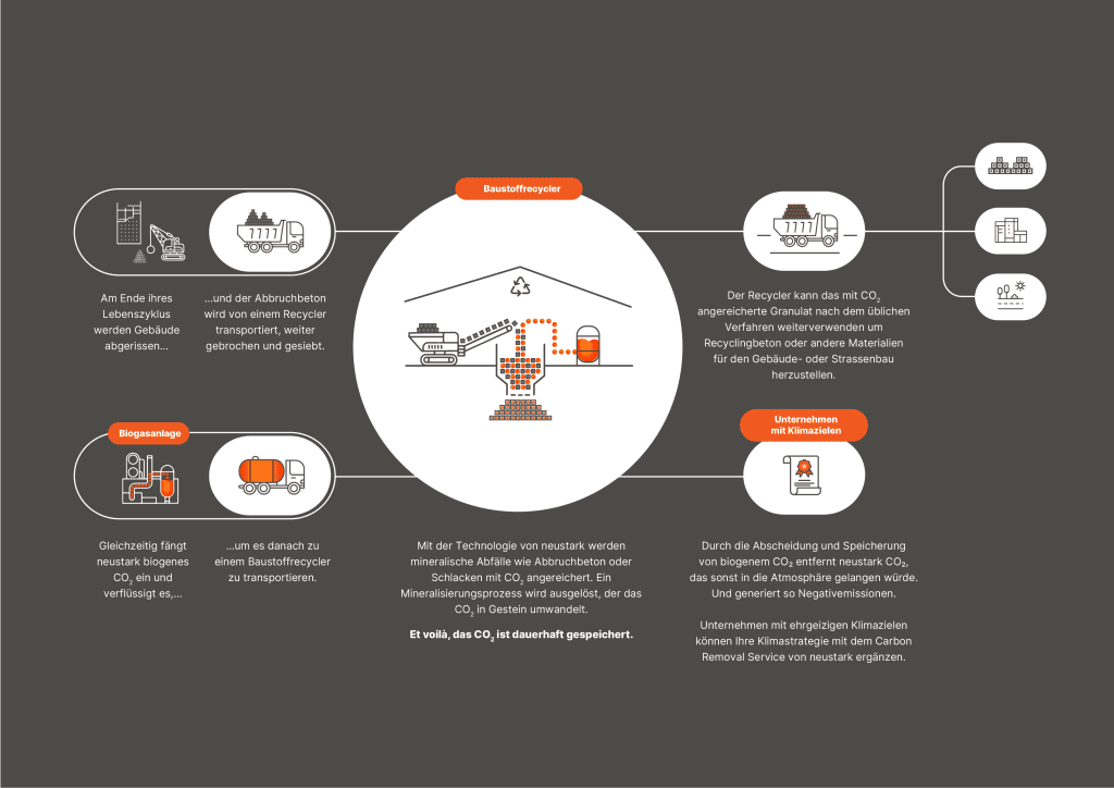 Das Prozedere: Um das CO2 zu gewinnen, arbeitet neustark mit Biogasanlagen zusammen. Diese trennen während der Biogasaufbereitung Methan von CO2. Mithilfe von neustarks innovativer Technologie, die direkt an der bestehenden Anlage installiert ist, wird das hochreine CO2 aufgefangen und verflüssigt. Danach wird es zu nahe gelegenen Speicheranlagen transportiert – hier arbeitet neustark mit Recyclern zusammen –, wo die mineralischen Abfallmaterialien wie Abbruchbetongranulat, Betonmischwasser, Schlacken oder Aschen mit dem CO2 in Verbindung gebracht werden und unterbrechungsfrei in bestehenden Produktionsprozessen integriert.